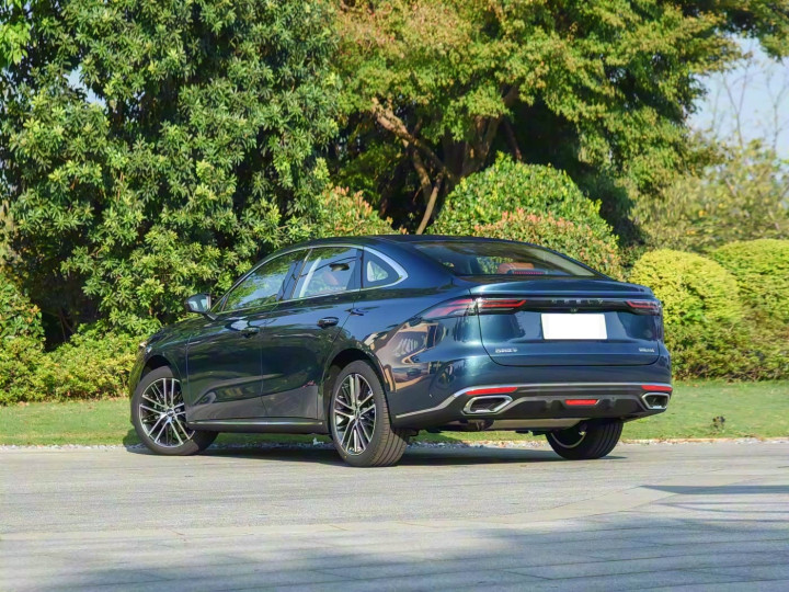 再来看车尾部分,车尾设计与车头形成呼应,重峦叠影 LED 超红光尾灯成为点睛之笔。两条灯带模仿远山层叠的剪影,点亮后辨识度极高,且采用豪华车同款超红光 LED,雨雾天穿透力比普通尾灯强 30%,大幅提升行车安全性。尾灯下方的镀铬饰条贯穿车尾,与双边共两出排气装饰(实际为隐藏式排气)搭配,增强了横向视觉宽度。车尾整体线条饱满圆润,既保证了后备箱的实用空间,又通过层叠设计营造出丰富的立体感,完美平衡了美学与实用性。