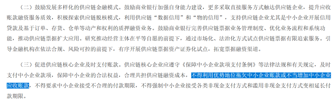 比如,不久前,相关部门就发布了《关于规范供应链金融业务引导供应链信息服务机构更好服务中小企业融资有关事宜的通知》。其中就指出,供应链核心企业……不得利用优势地位拖欠中小企业账款或不当增加中小企业应收账款。